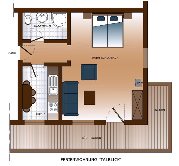Ein großer Wohn-Schlafraum, Vorraum, separate Küche, Bad; 2 - 3 Personen, (ca. 40 qm), großer Balkon auf der Ost- und Südseite |