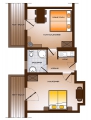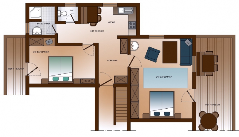Zwei unabhängige Schlafräume, ein Schlafraum ist als Wohnraum mit Doppelbett angelegt; Kochnische, Bad; (ca. 42 qm); 2 Balkone auf der Westseite |